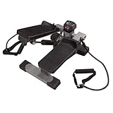 Featuring a battery-operated monitor displaying steps-per-minute, total steps, workout time, and calories burned, this portable stepping machine provides a cardiovascular workout while also offering elastic bands for toning back, arms, shoulders, and torso during a workout. The machine is small enough to easily store at home or in the office and light enough to transport between the two sites. It measures 16-1/4 inches x 12-1/8 inches x 12-1/4 inches and weighs 20 pounds. Two hydraulic cylinders provide a smooth stepping motion. Wide, textured steps keep feet secure. The elastic toning bands can be removed and provide medium resistance. Rubber floor protectors safeguard a workout area and prevent skidding. Made of steel, the frame carries a five-year warranty against defects, with parts warranted against defects for 90 days.